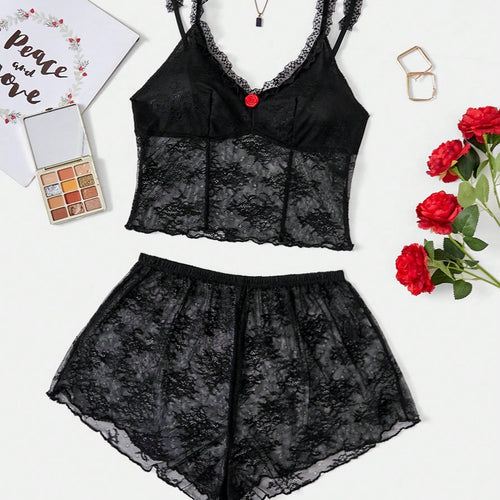 Tiny Roses Lace Pajamas Sheer Set - Black