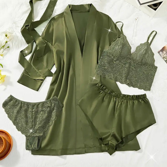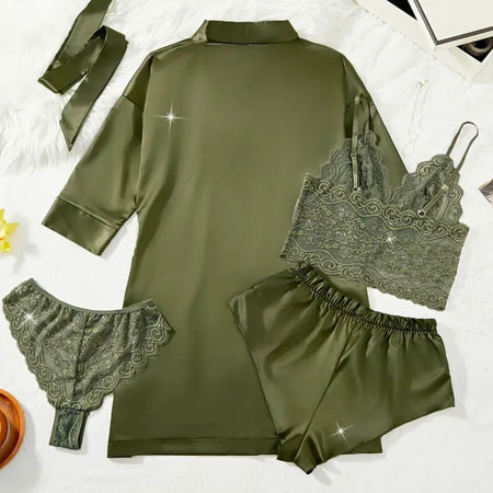 Azure Silk Lace 4 Piece Pajamas Set - Camouflage Green