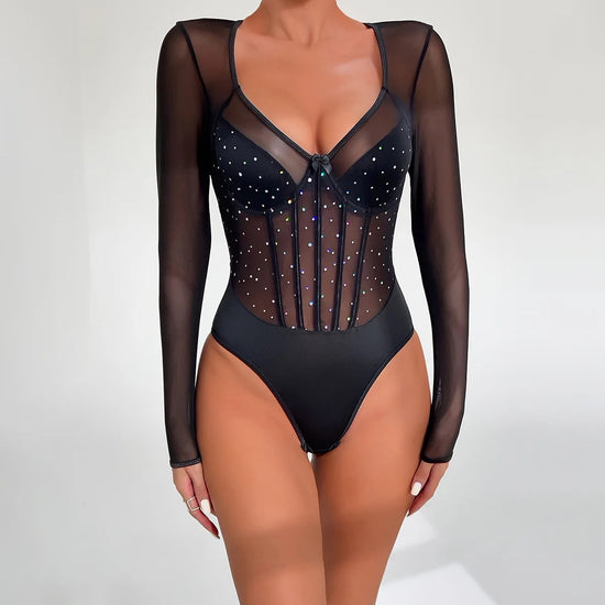 Lucy Mesh Sparkling Long Sleeve Bodysuit - Black