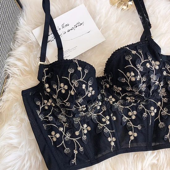 Rosalie Silk Embroidery Mesh Bustier - Black