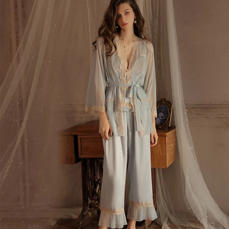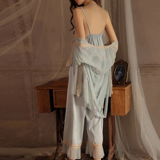 Brietta Silk Lace Pajamas Long Set - Baby Blue