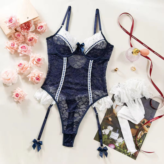 Sazha Lace Bodysuit + Stocking - Navy Blue