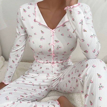 Carrie Floral Knitted Long Sleeve Pajamas - White