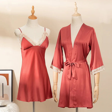 Meldy Silk Lace Robe Pajamas Set - Bronze