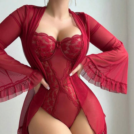 Tuvalu Lace Bodysuit + Robe - Red | Sunny Bright